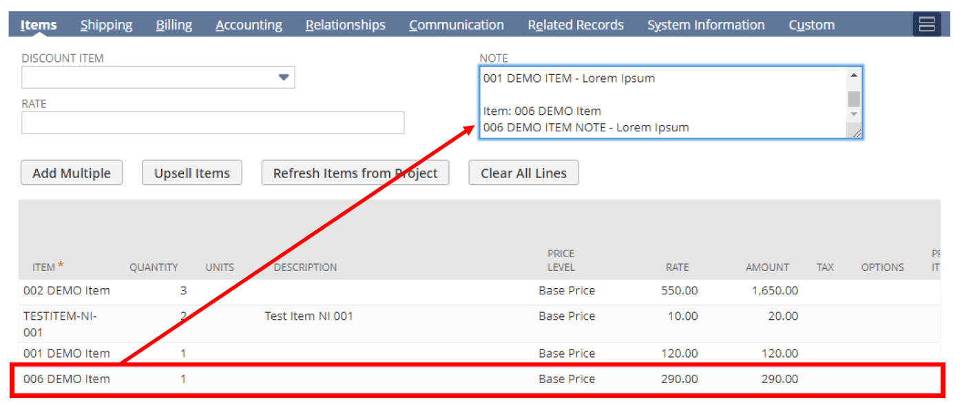 1. A custom body field will be displayed under the Items subtab that will collect and display all the notes from the Inventory Items listed.