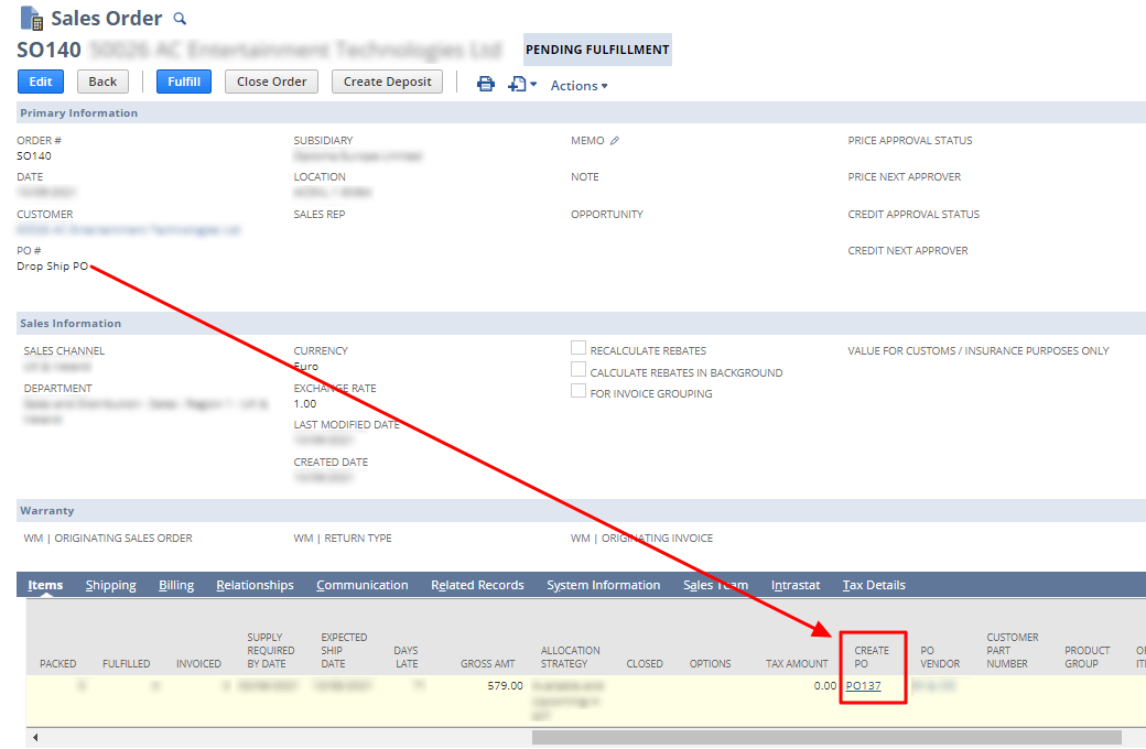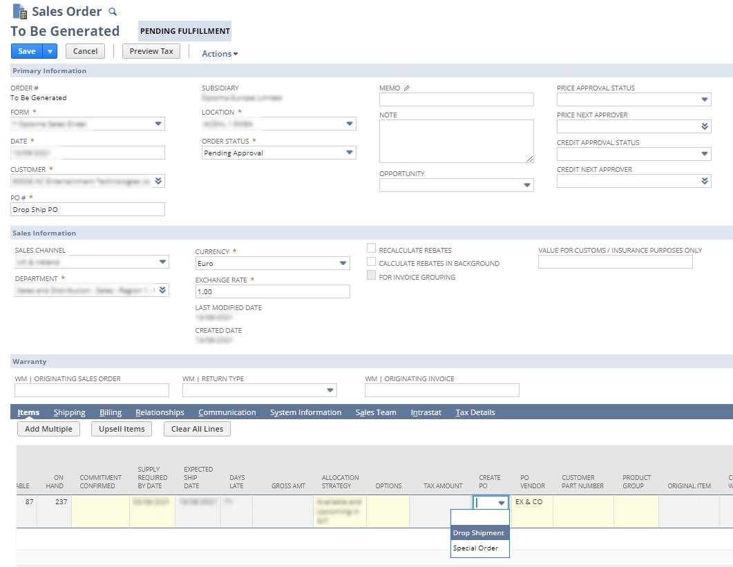 1. Create a Drop Shipment purchase order from the Sales Order form.